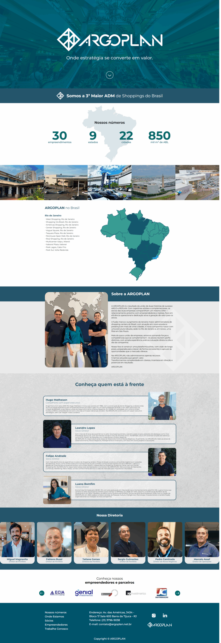 A ARGOPLAN é o resultado da união de duas histórias de sucesso: ARGO e REPLAN. Com trajetórias sólidas e complementares, os sócios das duas empresas compartilham um mesmo DNA — relacionamento próximo com empreendedores e lojistas, foco em eficiência operacional e dedicação ativa à geração de valor para os ativos.