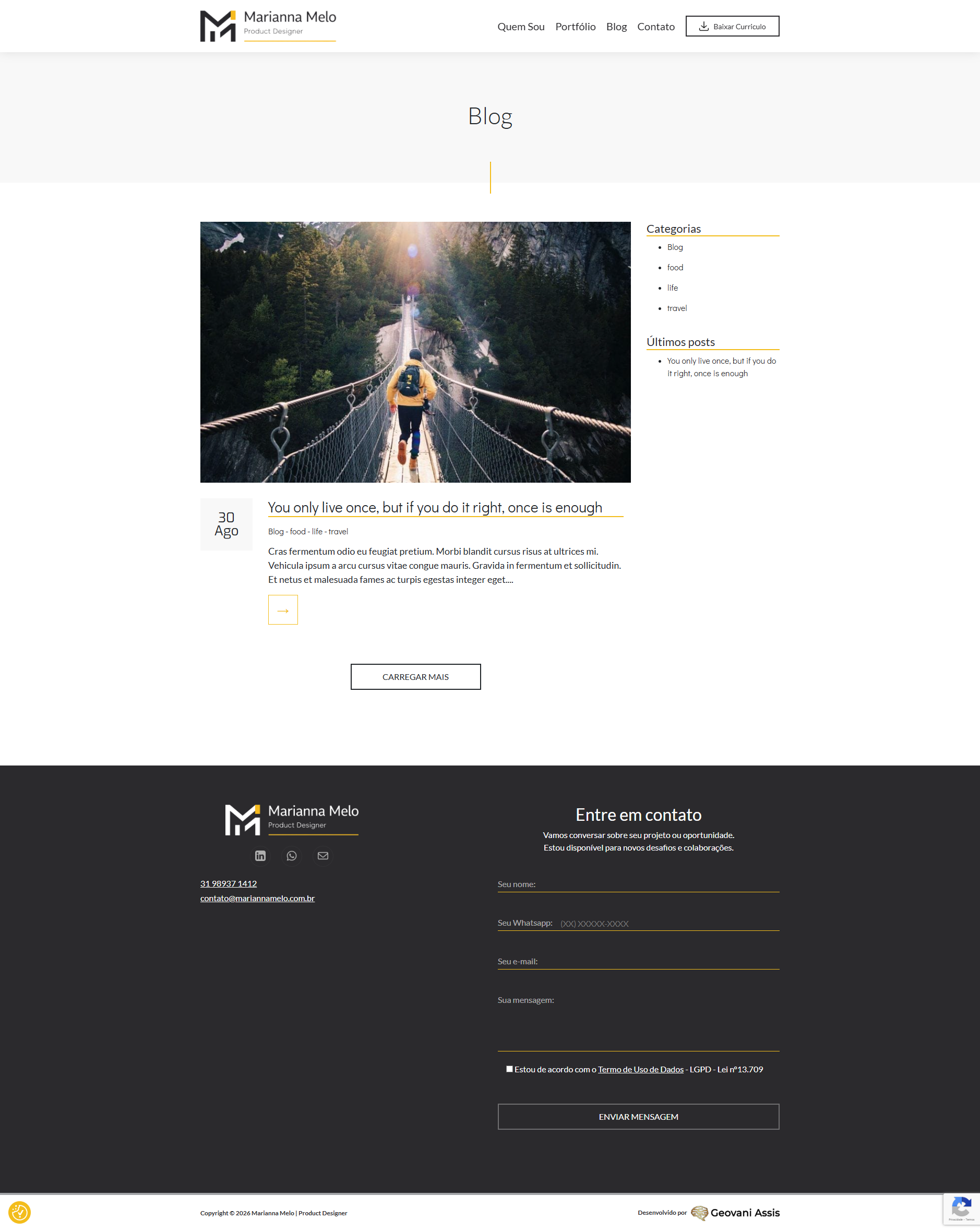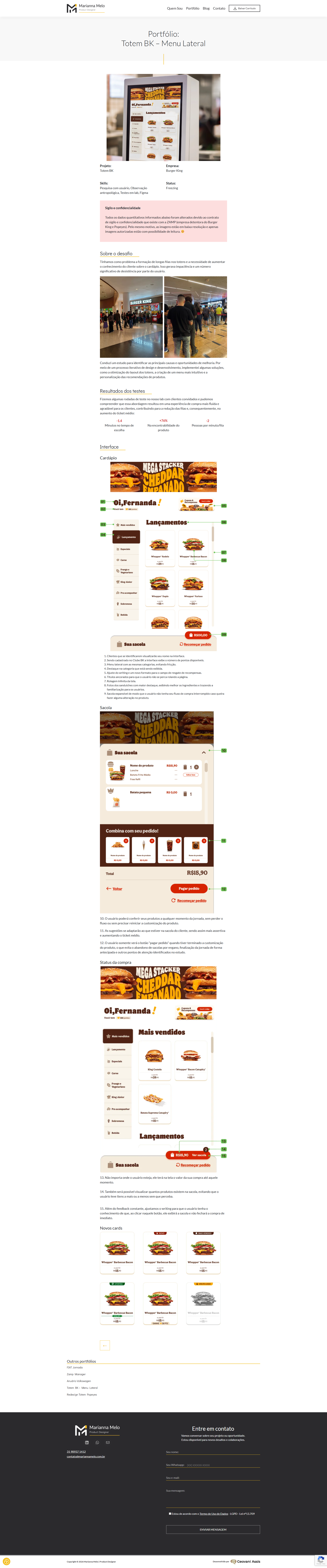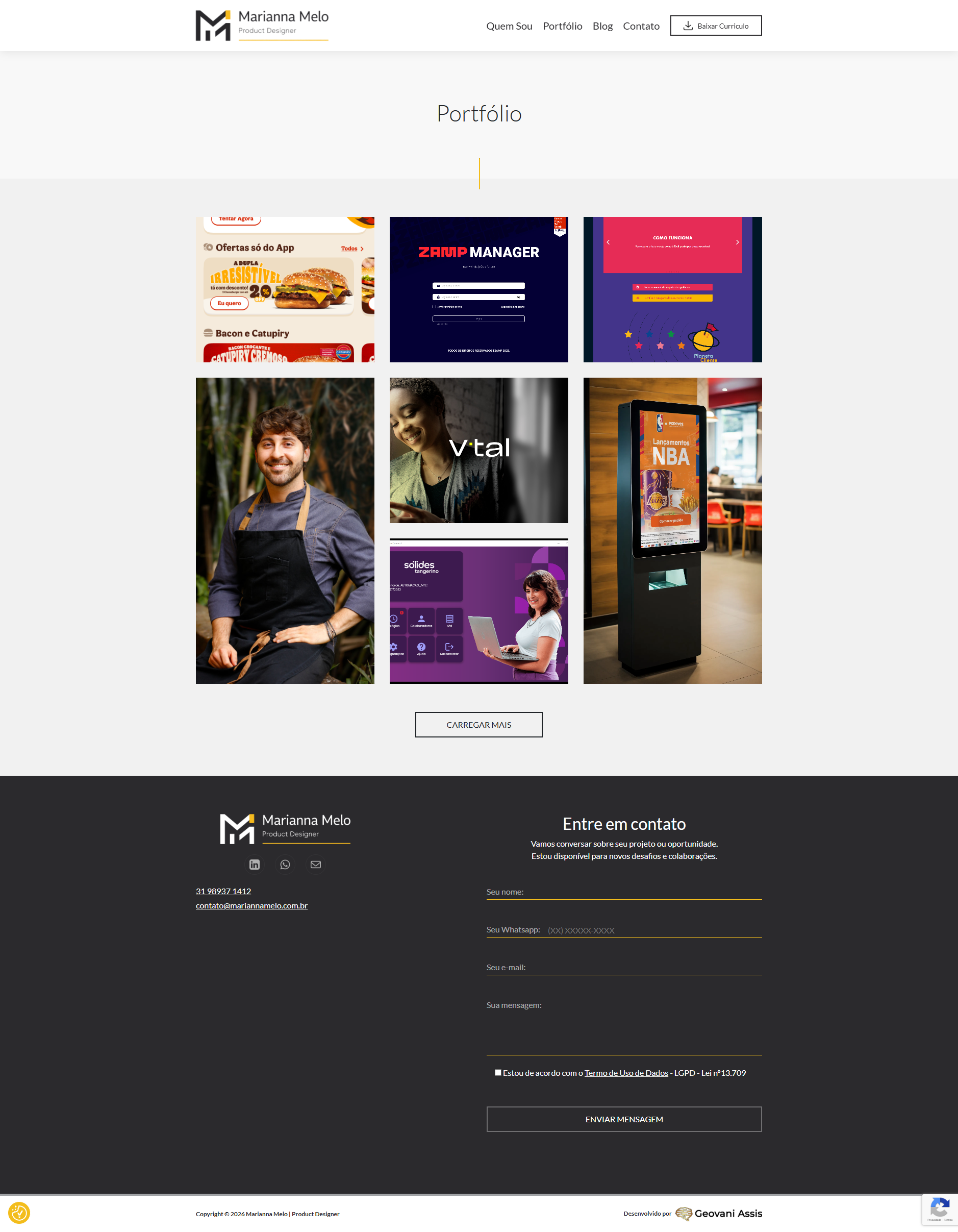 Desenvolvimento de website institucional para a designer de produtos Marianna Melo, com foco em apresentação profissional, clareza de portfólio e fortalecimento da marca pessoal. O projeto priorizou uma interface limpa, navegação intuitiva e estrutura orientada à conversão, permitindo destacar projetos, competências e trajetória profissional de forma objetiva e elegante. O site foi desenvolvido com abordagem responsiva, garantindo boa experiência em diferentes dispositivos e reforçando a presença digital da profissional.